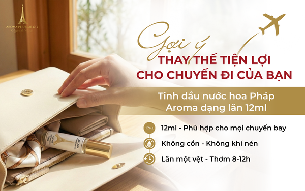 Và nếu bạn muốn vừa thơm – vừa tiện – vừa hợp chuẩn bay quốc tế, hãy chọn tinh dầu nước hoa Aroma dạng lăn 12ml: Lựa chọn nhỏ gọn, hợp quy định, thơm lâu và an toàn tuyệt đối cho mọi chuyến bay.