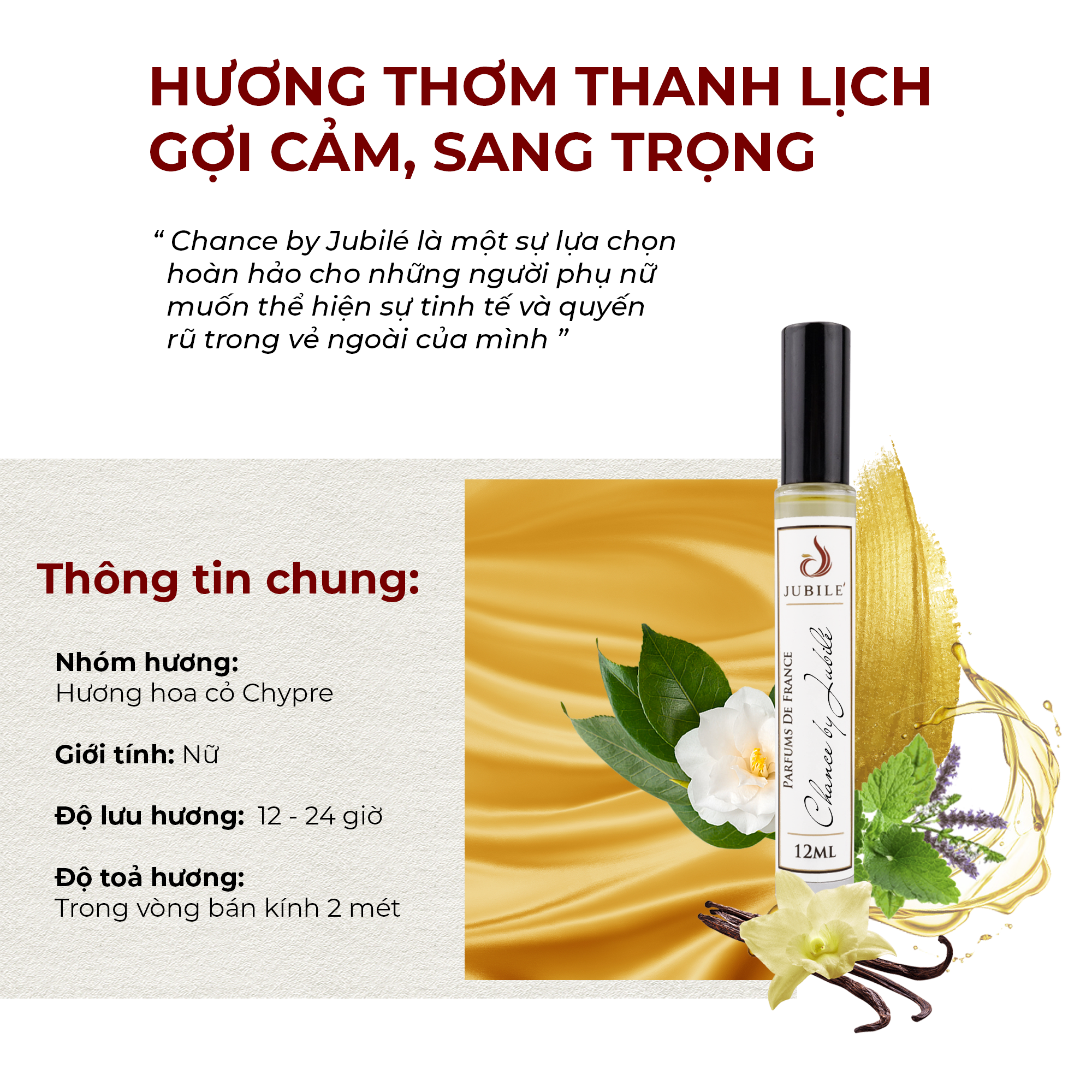 Chance by Jubilé là lựa chọn tuyệt vời cho những ai tìm kiếm một mùi hương nữ tính, tươi mới nhưng vẫn thanh lịch và đậm chất riêng. Không chỉ là nước hoa, đây còn là một hành trình cảm xúc giúp nàng cảm thấy thư thái, tự tin và lấp lánh hơn mỗi ngày.